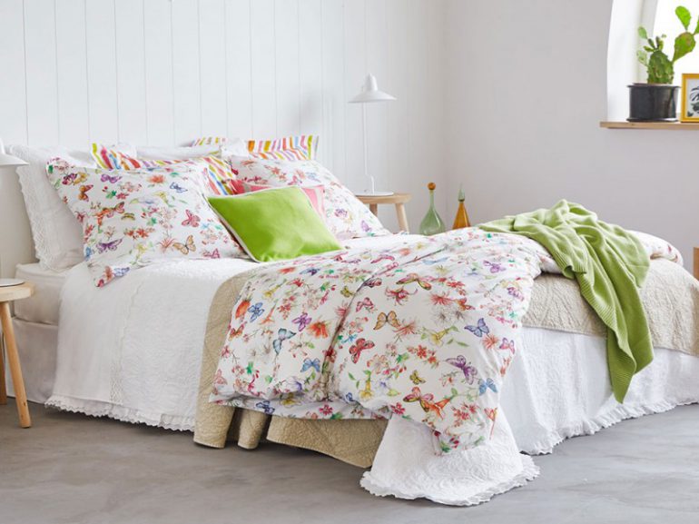 Ecco quindi che il letto diventa un vero e proprio “prato fiorito”, mentre sulle fodere svolazzano allegre farfalle. Tutta la collezione, dalle lenzuola, ai vasi in ceramica e complementi vari, fino alle spugne per il bagno, giocano con il Greenery, colore Pantone del 2017, per una camera romantica e fresca.