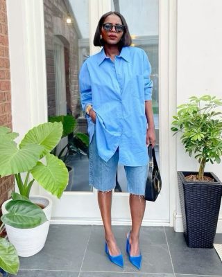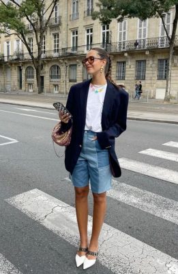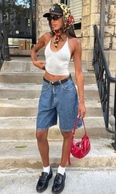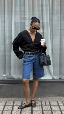 I bermuda in denim possono anche essere adattati per l’ufficio, mantenendo un look professionale. Opta per un paio di bermuda di lunghezza adeguata, abbinali a una camicia button-down e mocassini. Una tote bag strutturata e gioielli minimalisti completano questo look elegante.