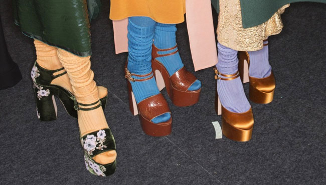 Sì alle calze, ma il colore dev’essere shock! Però nel dubbio se sia meglio calza o calzino, Alessandro Michele mette entrambi sovrapponendoli e abbinandoli ad un sandalo (immagine al centro).