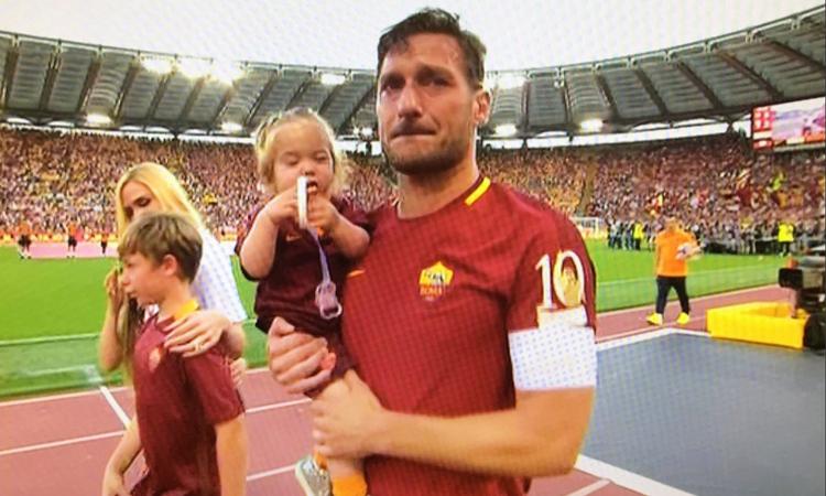 Al termine della partita i due figli maggiori della coppia, Cristian e Chanel (per lei un futuro proprio nel calcio giallorosso) sono scesi in campo insieme a ilary Blasi, cpon ancora la tshirt indosso, per salutare il papà. Con loro anche la piccola Isabel, nata lo scorso marzo, fotografata in braccio a papà Totti, che inevitabilmente si commuove.