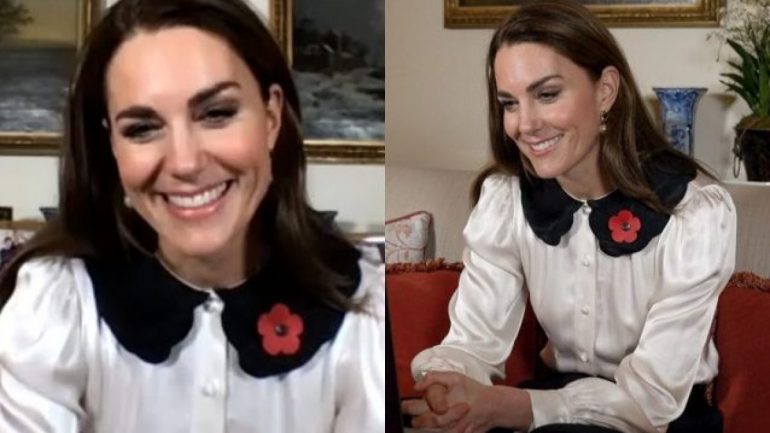 Kate ha decorato il colletto con una spilla a forma di papavero, simbolo nazionale della memoria sin dalla prima guerra mondiale, visto che il tema era il Remembrance Day.