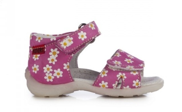 Sandalo chiuso dietro con velcro realizzato in capra laminata con margherita applicata sulla tomaia e imbottitura giro caviglia. Fodera in pelle pieno fiore. Morbido plantarino flex e suola in TR con battistrada e disegno antiscivolo esclusivo kickers.