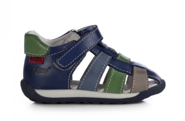 Sandalo chiuso dietro con velcro, realizzato in morbido nubuk ed esclusiva serigrafia kickers. Fodera in pelle pieno fiore. Morbido plantarino flex e suola in TR con battistrada e disegno antiscivolo esclusivo kickers.