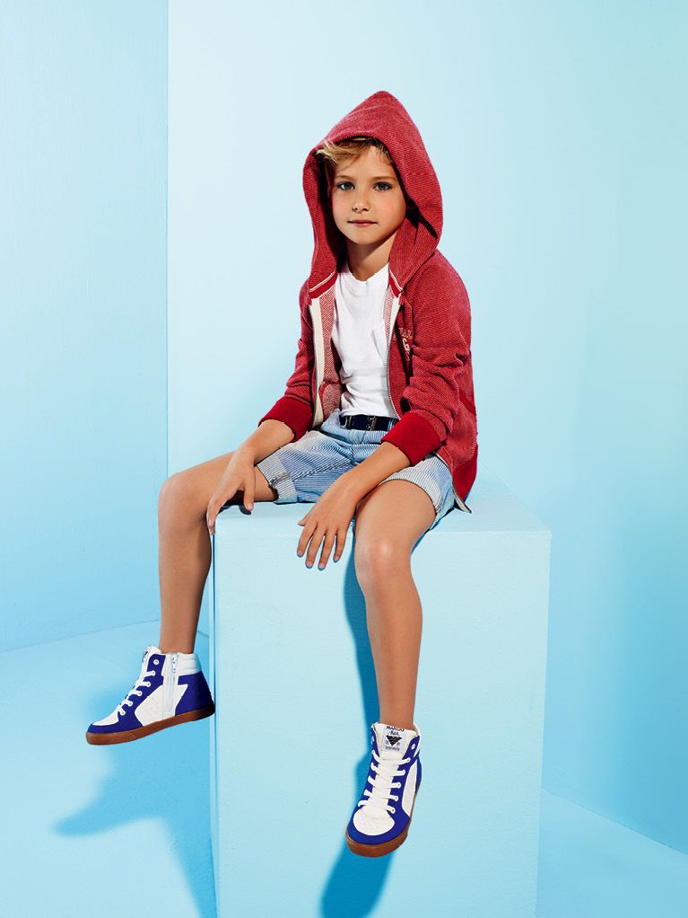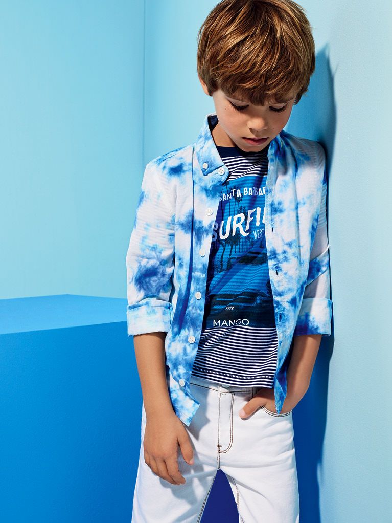 Il Boy di Mango Kids esprime il suo stile urbano in Just Trendy, con reminiscenze nautiche dai toni blu, celeste cielo, blu navy che si combinano con fantasie denim, pompelmo e dusty framboise.