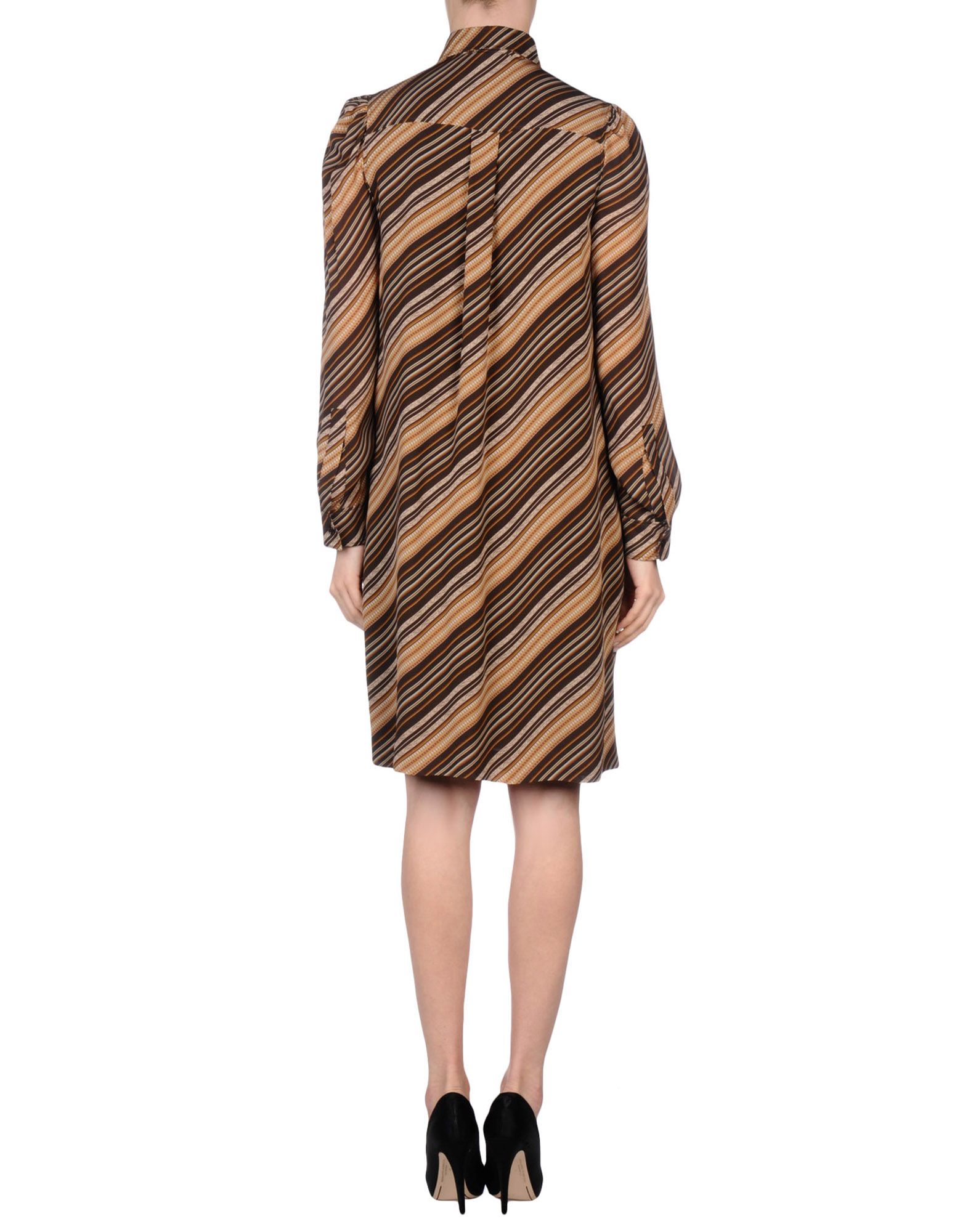 Ma le tendenze moda vintage appartiene anche ad altri brand di moda: volete un esempio? Guardate alcuni capi di Chloé per la prossima stagione! Righe diagonali giocate sul marrone beige per questo abito dalla linea dritta ma scivolata sul fianco. Leggera increspatura sulle spalle e al polsino, collo alto, lunghezza al ginocchio. Non vi richiama alla mente i ruggenti Seventies?