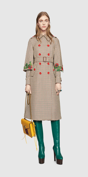 Minidress in seta con bordatura rossa per le tendenze moda vintage della maison Gucci, con leggera increspatura sul punto vita, collo bon ton in pieno stile collegiale per un capo realizzato in seta dal colore delicato. Stesso mood anche per gli stivali in pelle verde con ricami frontali, cavigliera e morsetti laterali con la classica e intramontabile G.