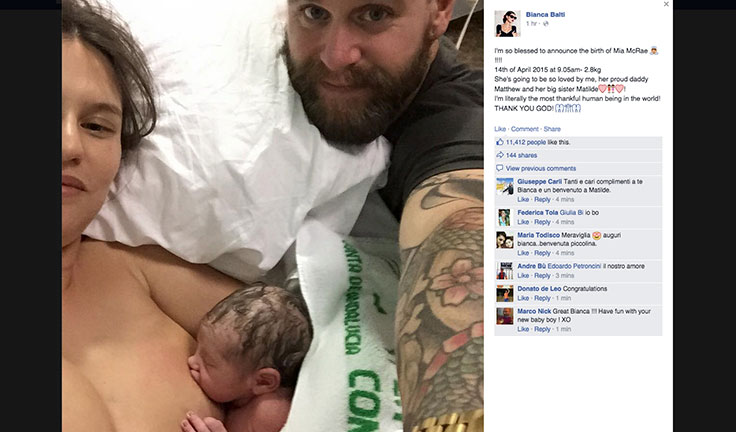 Compirà un mese il 14 maggio Mia, secondogenita della top model Bianca Balti, che già si mostra splendida in lingerie e tenerissima mamma.