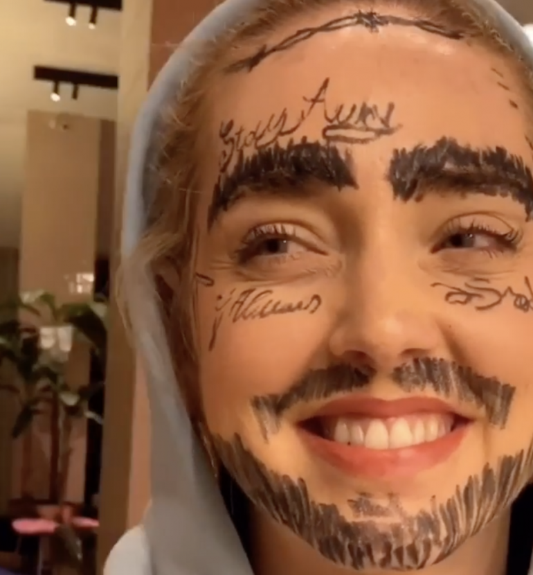 Chiara Ferragni è irriconoscibile con baffi, barba, sopracciglia folte, basette e una serie di tatuaggi su guance e fronte, e quando si volta, non più coperta dal cappuccio, scoppia a ridere.